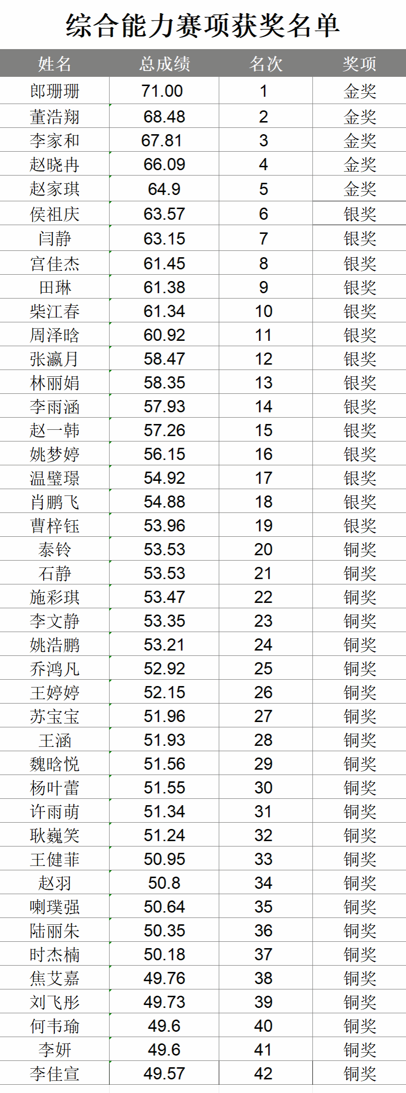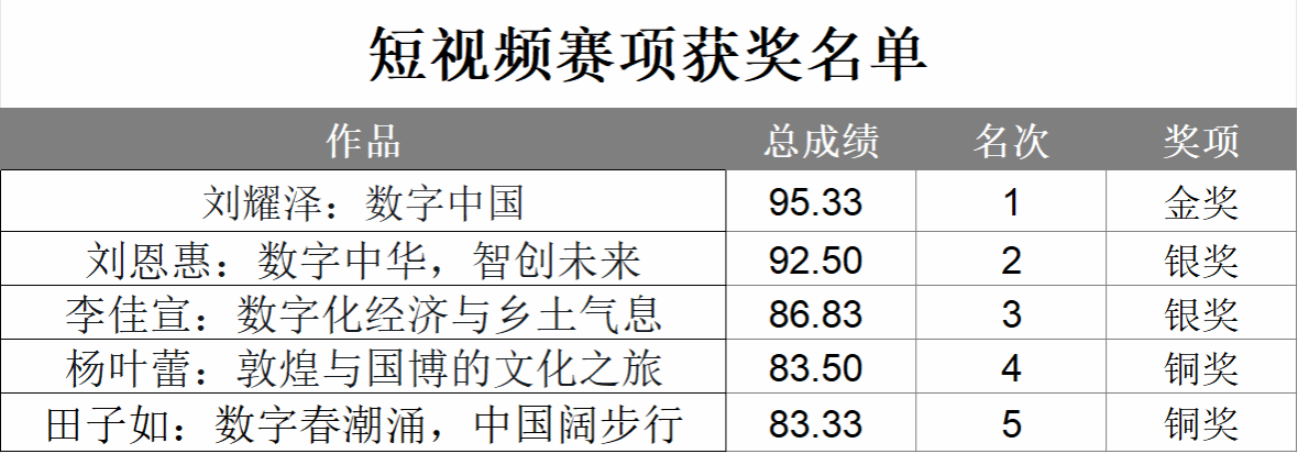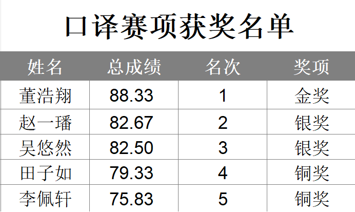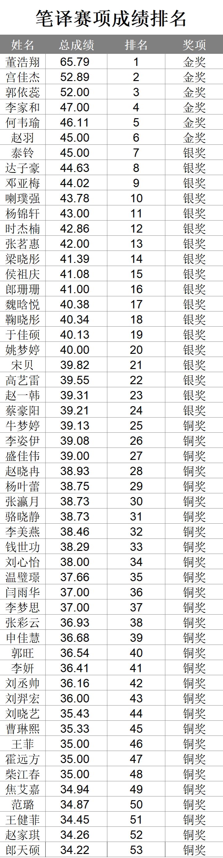 大赛设置了金、银、铜三个奖项级别,涵盖了口译、笔译、演讲、综合能力及短视频等多个赛项。其中,演讲、口译赛项分别有5名选手脱颖而出;笔译赛项共计53人获奖;综合能力赛项获奖人数为42人;短视频赛项有5部作品荣获奖项。