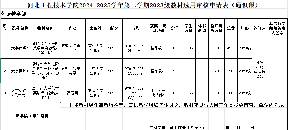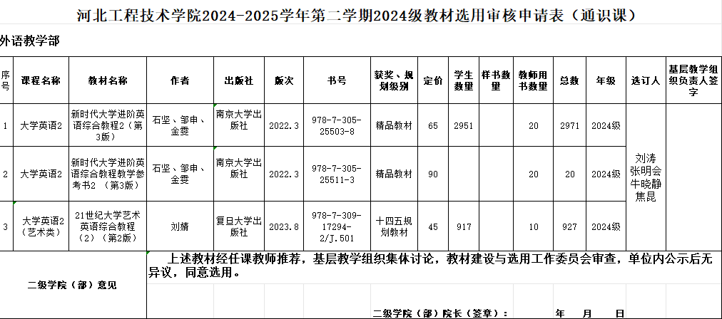 根据教便字〔2024〕110号《EMC易倍官方网站关于做好2024-2025学年第二学期教材选用工作的通知》文件相关精神,经任课教师推荐,基层教学组织集体讨论,教材建设与选用工作委员会审查,现将EMC易倍官方网站外语教学部2024-2025学年第二学期大学英语2,大学英语4课程教材选用情况进行公示,价格以教材封底定价为准。