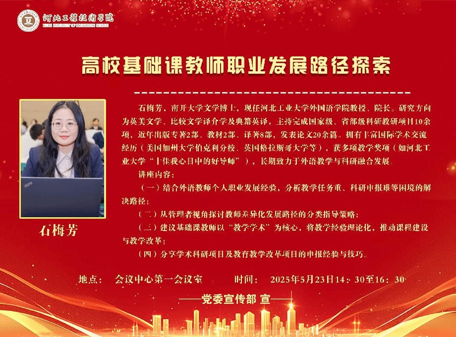 主讲人简介:石梅芳,南开大学文学博士,现任河北工业大学外国语公司教授、经理。研究方向为英美文学、比较文学译介学及典籍英译,主持完成国家级、省部级科研教研项目10余项,近年出版专著2部、教材2部、译著8部,发表论文20余篇。拥有丰富国际学术交流经历(美国加州大学伯克利分校、英国格拉斯哥大学等),获多项教学奖项(如河北工业大学“十佳我心目中的好导师”),长期致力于外语教学与科研融合发展。