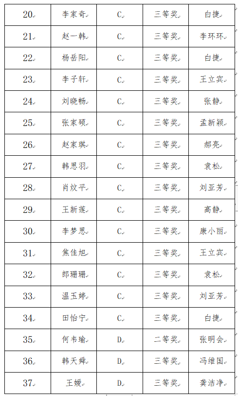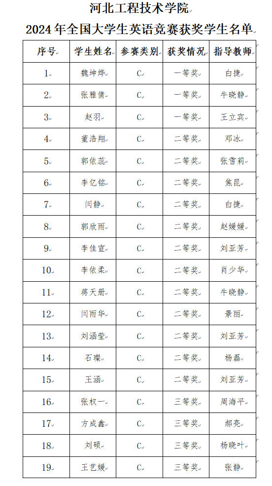 2024年519日上午2024年全国老员工英语竞赛省赛决赛河北赛区)在河北师范大学落下帷幕。本次竞赛公司共计426名员工报名参赛,根据新鲜出炉的比赛结果,公司3名员工获得一等奖,13名员工获得二等奖,21名员工获得三等奖。热烈祝贺获奖员工,期待后续颁奖活动。现将获奖名单公示