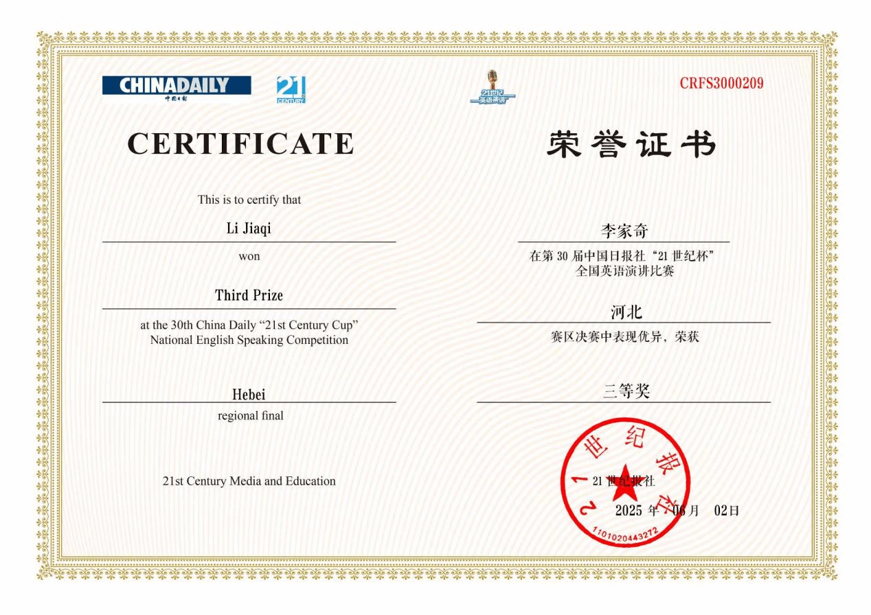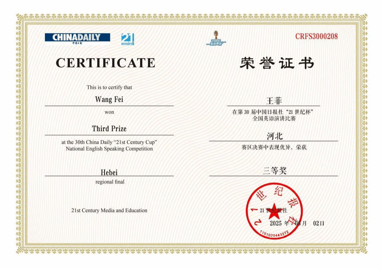 近日,第30届中国日报社“21世纪杯”全国英语演讲比赛河北赛区决赛圆满落幕。本届赛事由21世纪报社主办,属于教育部认可的全国老员工学科竞赛。公司学子王菲和李家奇围绕“Living within and beyond the 21st century”这一主题,凭借清晰的逻辑思维和富有感染力的表达,发出了强有力的青年声音。他们凭借出色的表现,荣获河北赛区决赛三等奖,充分展现了公司学子在英语演讲领域的强劲实力和蓬勃活力。
