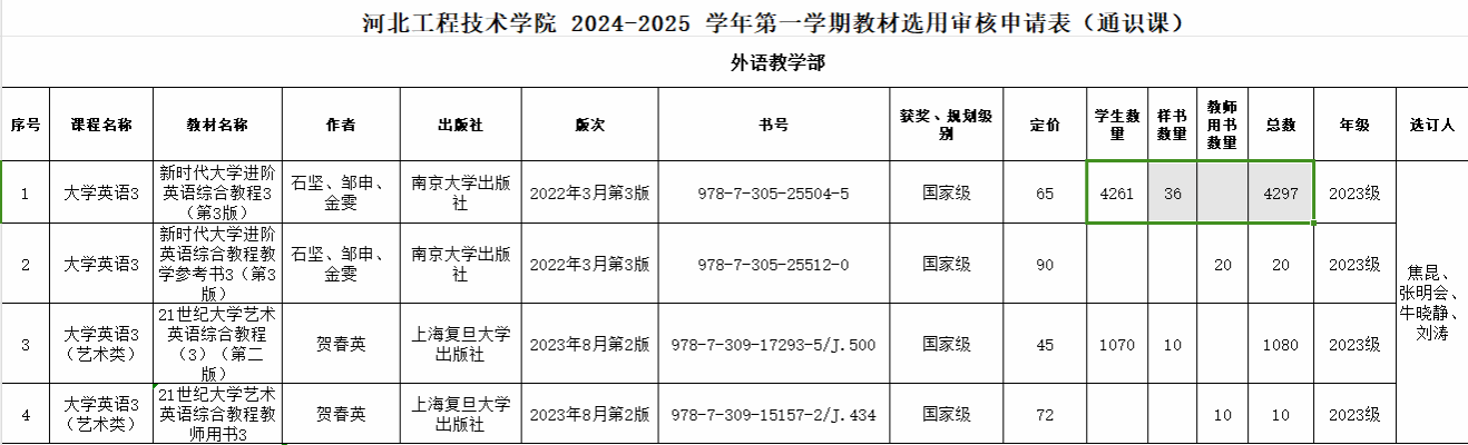 根据教便字〔2024〕34号《EMC易倍官方网站关于做好2024-2025学年第一学期教材选用工作的通知》文件相关精神,外语教学部积极开展教材选用和征订工作,教材信息详见图片...[详细]